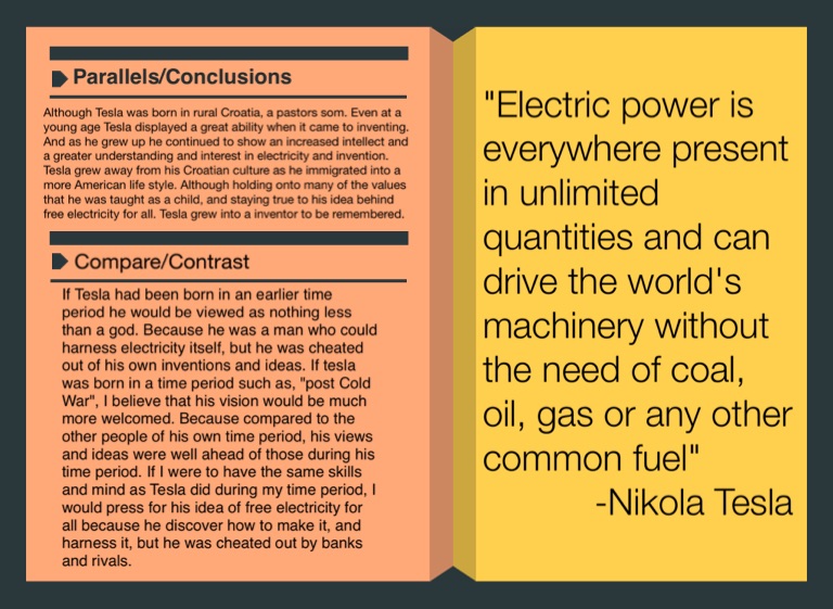 If Tesla had been born in an earlier time period he would be viewed as nothing less than a god. Because he was a man who could harness electricity itself, but he was cheated out of his own inventions and ideas. If tesla was born in a time period such as, "post Cold War", I believe that his vision would be much more welcomed. Because compared to the other people of his own time period, his views and ideas were well ahead of those during his time period. If I were to have the same skills and mind as Tesla did during my time period, I would press for his idea of free electricity for all because he discover how to make it, and harness it, but he was cheated out by banks and rivals.