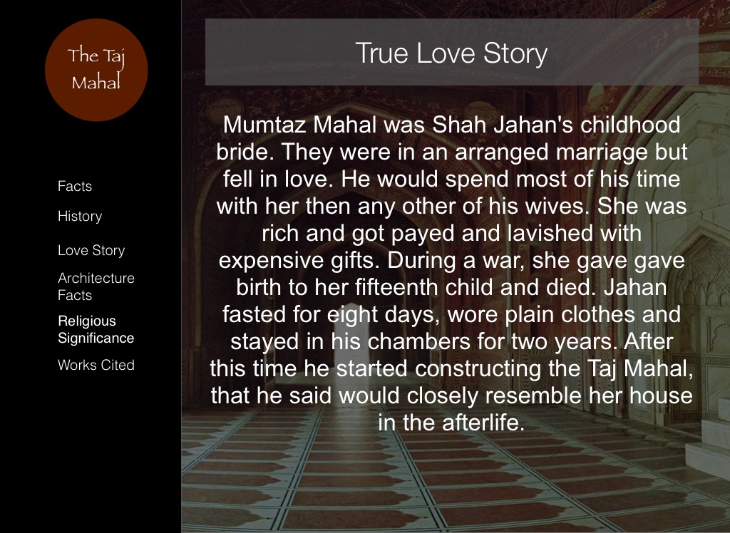 Mumtaz Mahal was Shah Jahan's childhood bride. They were in an arranged marriage but fell in love. He would spend most of his time with her then any other of his wives. She was rich and got payed and lavished with expensive gifts. During a war, she gave gave birth to her fifteenth child and died. Jahan fasted for eight days, wore plain clothes and stayed in his chambers for two years. After this time he started constructing the Taj Mahal, that he said would closely resemble her house in the afterlife.