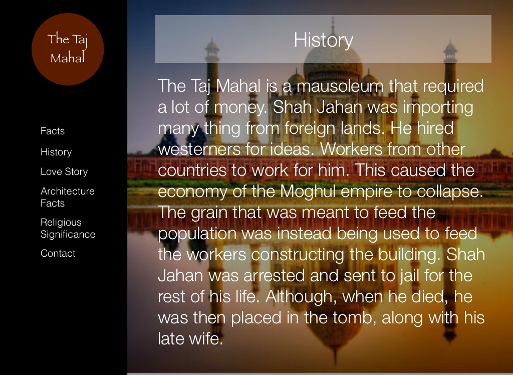 The Taj Mahal is a mausoleum that required a lot of money. Shah Jahan was importing many thing from foreign lands. He hired westerners for ideas. Workers from other countries to work for him. This caused the economy of the Moghul empire to collapse. The grain that was meant to feed the population was instead being used to feed the workers constructing the building. Shah Jahan was arrested and sent to jail for the rest of his life. Although, when he died, he was then placed in the tomb, along with his late wife.