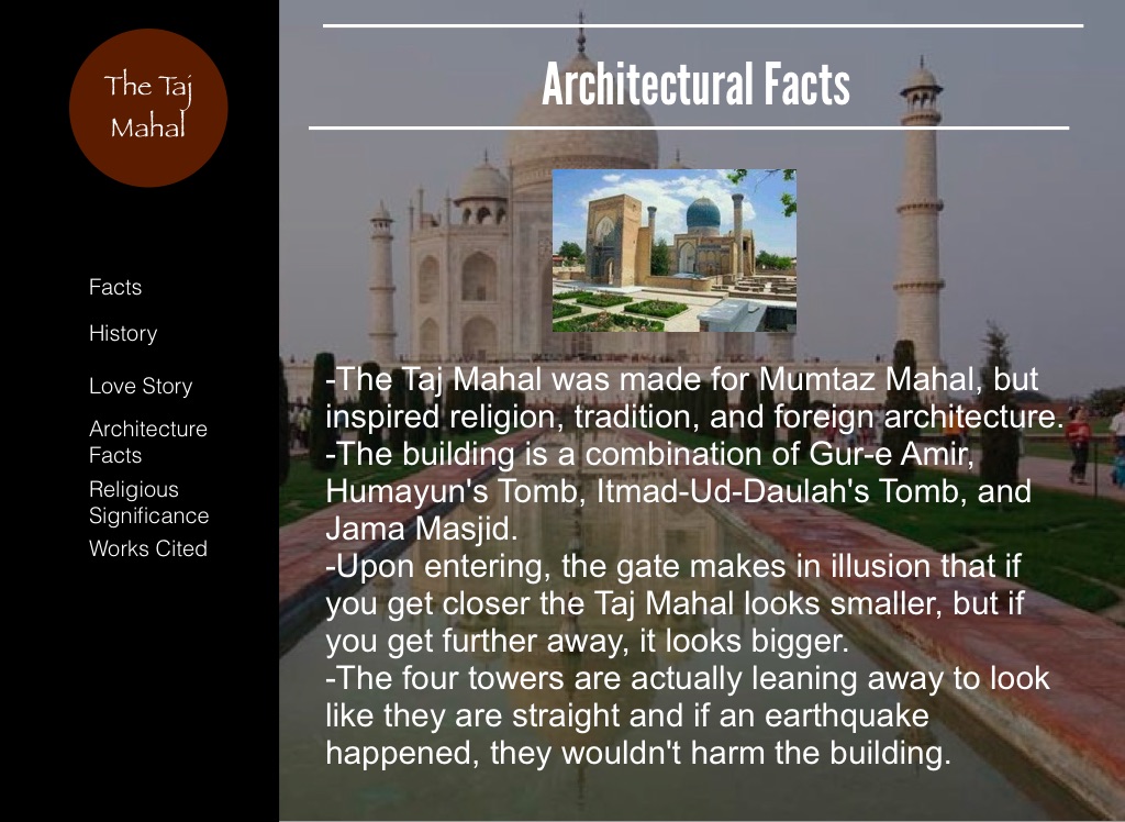 -The Taj Mahal was made for Mumtaz Mahal, but inspired religion, tradition, and foreign architecture.