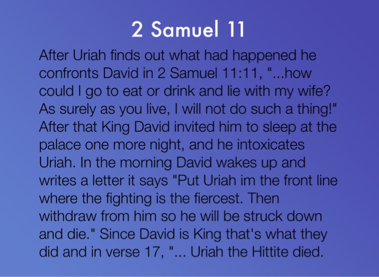 After Uriah finds out what had happened he confronts David in 2 Samuel 11:11, "...how could I go to eat or drink and lie with my wife? As surely as you live, I will not do such a thing!" After that King David invited him to sleep at the palace one more night, and he intoxicates Uriah. In the morning David wakes up and writes a letter it says "Put Uriah im the front line where the fighting is the fiercest. Then withdraw from him so he will be struck down and die." Since David is King that's what they did and in verse 17, "... Uriah the Hittite died.