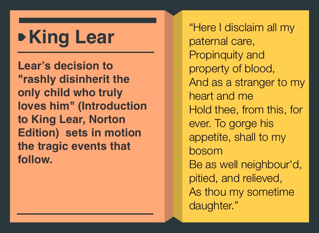 Lear’s decision to "rashly disinherit the only child who truly loves him" (Introduction to King Lear, Norton Edition) sets in motion the tragic events that follow.