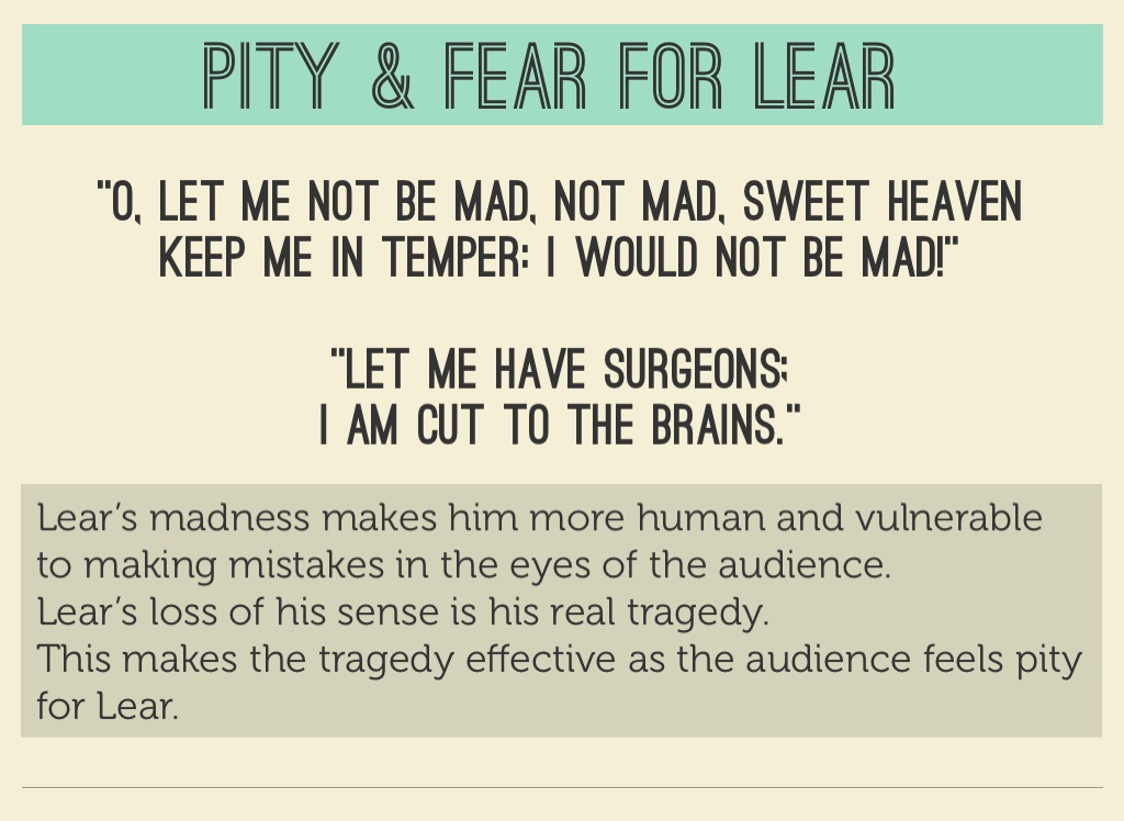 Lear’s madness makes him more human and vulnerable to making mistakes in the eyes of the audience.