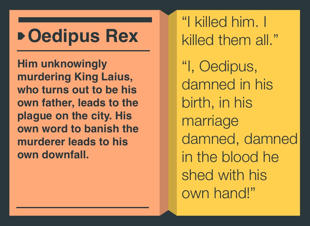 Him unknowingly murdering King Laius, who turns out to be his own father, leads to the plague on the city. His own word to banish the murderer leads to his own downfall.