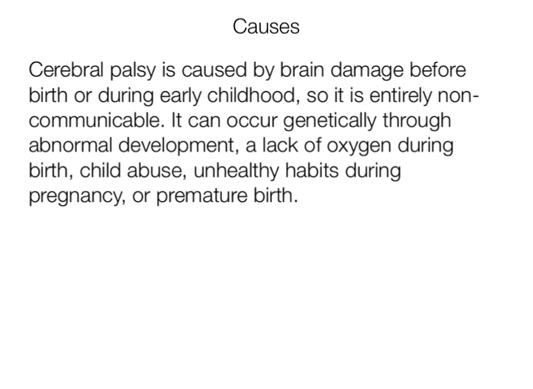 Cerebral palsy is caused by brain damage before birth or during early childhood, so it is entirely non-communicable. It can occur genetically through abnormal development, a lack of oxygen during birth, child abuse, unhealthy habits during pregnancy, or premature birth.