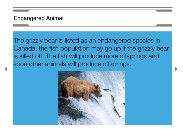 The grizzly bear is listed as an endangered species in Canada, the fish population may go up if the grizzly bear is killed off. The fish will produce more offsprings and soon other animals will produce offsprings.