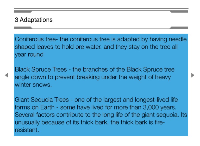 Coniferous tree- the coniferous tree is adapted by having needle shaped leaves to hold ore water. and they stay on the tree all year round