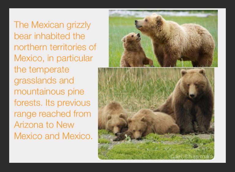 The Mexican grizzly bear inhabited the northern territories of Mexico, in particular the temperate grasslands and mountainous pine forests. Its previous range reached from Arizona to New Mexico and Mexico.