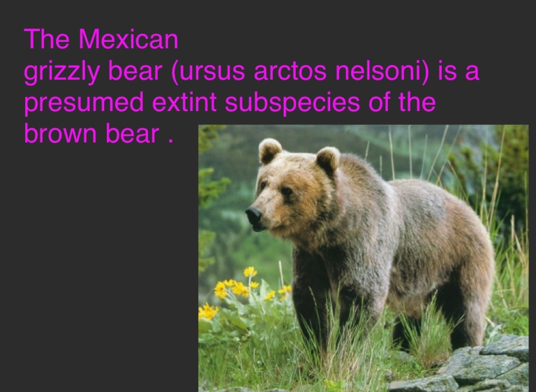 grizzly bear (ursus arctos nelsoni) is a presumed extint subspecies of the brown bear .
