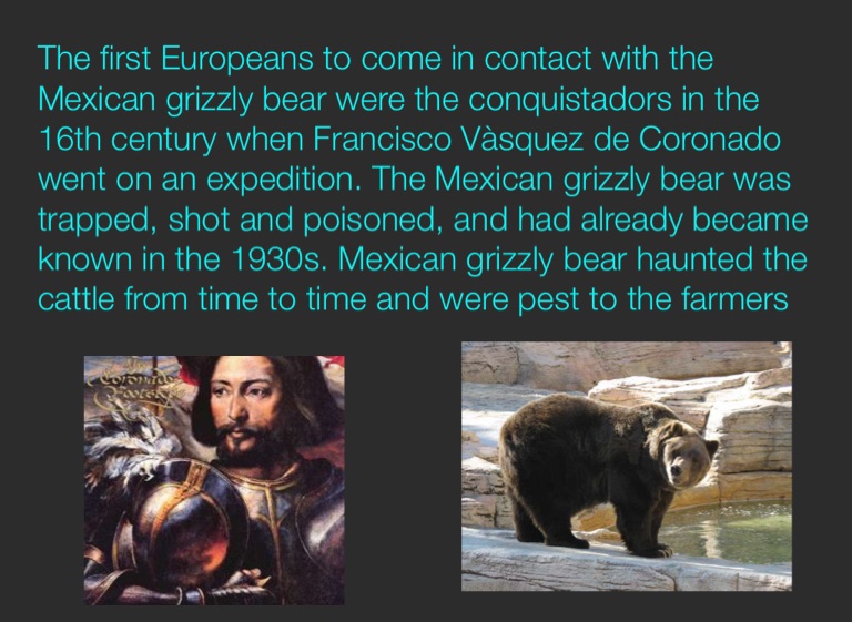 The first Europeans to come in contact with the Mexican grizzly bear were the conquistadors in the 16th century when Francisco Vàsquez de Coronado went on an expedition. The Mexican grizzly bear was trapped, shot and poisoned, and had already became known in the 1930s. Mexican grizzly bear haunted the cattle from time to time and were pest to the farmers