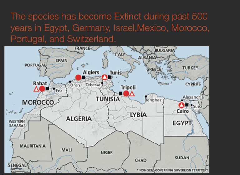 The species has become Extinct during past 500 years in Egypt, Germany, Israel,Mexico, Morocco, Portugal, and Switzerland.