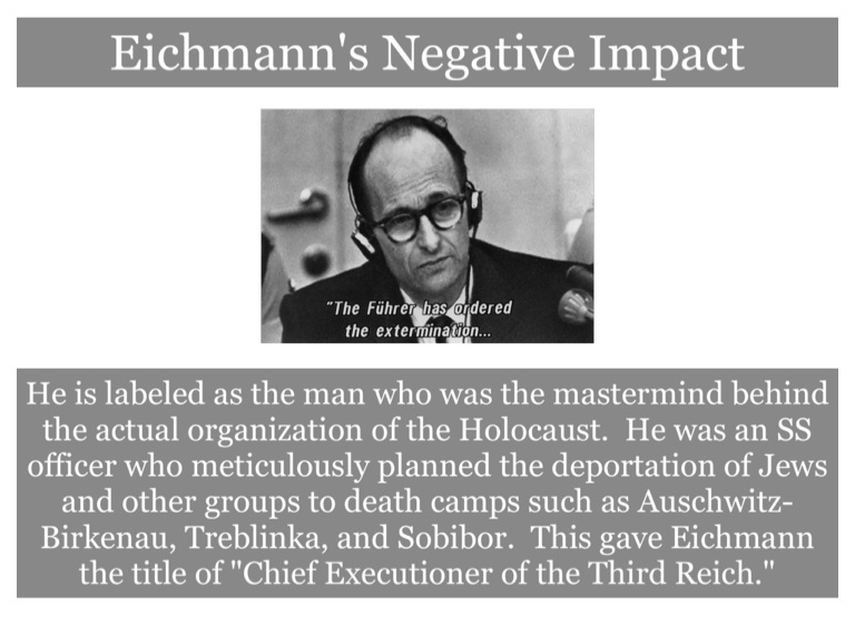 He is labeled as the man who was the mastermind behind the actual organization of the Holocaust. He was an SS officer who meticulously planned the deportation of Jews and other groups to death camps such as Auschwitz- Birkenau, Treblinka, and Sobibor. This gave Eichmann the title of "Chief Executioner of the Third Reich."