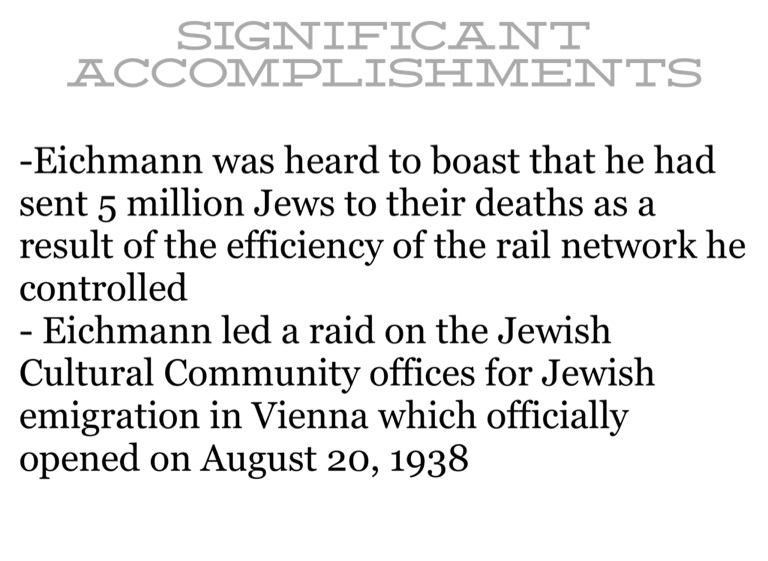 -Eichmann was heard to boast that he had sent 5 million Jews to their deaths as a result of the efficiency of the rail network he controlled
