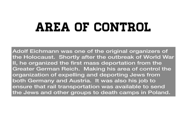 Adolf Eichmann was one of the original organizers of the Holocaust. Shortly after the outbreak of World War II, he organized the first mass deportation from the Greater German Reich. Making his area of control the organization of expelling and deporting Jews from both Germany and Austria. It was also his job to ensure that rail transportation was available to send the Jews and other groups to death camps in Poland.