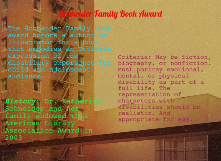 The Schneider Family book award honors a author or illustrator for a book that embodies an artistic expression of the disability experience for child and adolescent audience.