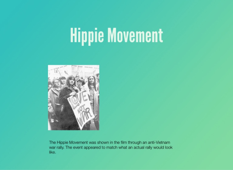 The Hippie Movement was shown in the film through an anti-Vietnam war rally. The event appeared to match what an actual rally would look like.