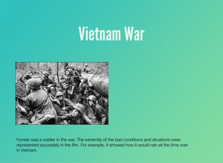 Forrest was a soldier in the war. The extremity of the bad conditions and situations were represented accurately in the film. For example, it showed how it would rain all the time over in Vietnam.