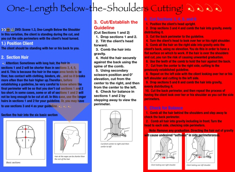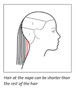 and 6. This is because the hair in the nape area tends to be finer, has contact with clothing, binders, etc., and so it breaks more often than the hair higher up.Therefore, before establishing a guideline, be very careful to know where the final perimeter will be so that you don’t cut sections 1 and 2 too short. In some cases, some or all of sections 1 and 2 will not be long enough to be cut at all. In this case, use the longer hairs in sections 1 and 2 for your guideline. Or, you may have to use sections 3 and 4 as your guideline.💫💫💫