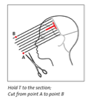 5. On the right side, hold the hair in your fingers and use primary scissors position to cut from Point A to Point B.
