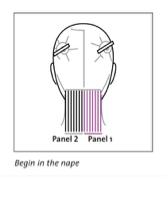 1. Starting at the nape, create a V” to 1” subsection, depending on the density of the hair. Divide the subsection into two panels, each narrower than the length of the barrel.