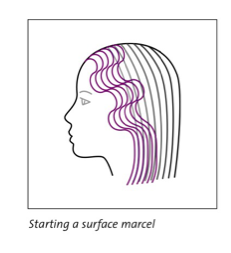 • Then move around the head, matching up the ridges and troughs, and marcelling only the top layer of hair. Turn