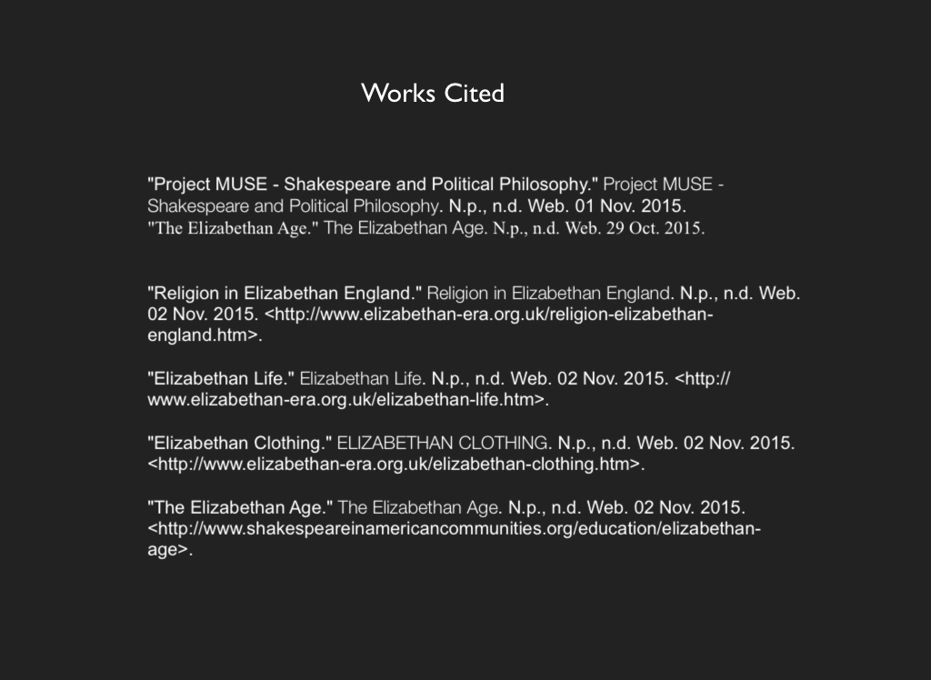 "The Elizabethan Age." The Elizabethan Age. N.p., n.d. Web. 02 Nov. 2015. <http://www.shakespeareinamericancommunities.org/education/elizabethan-age>.