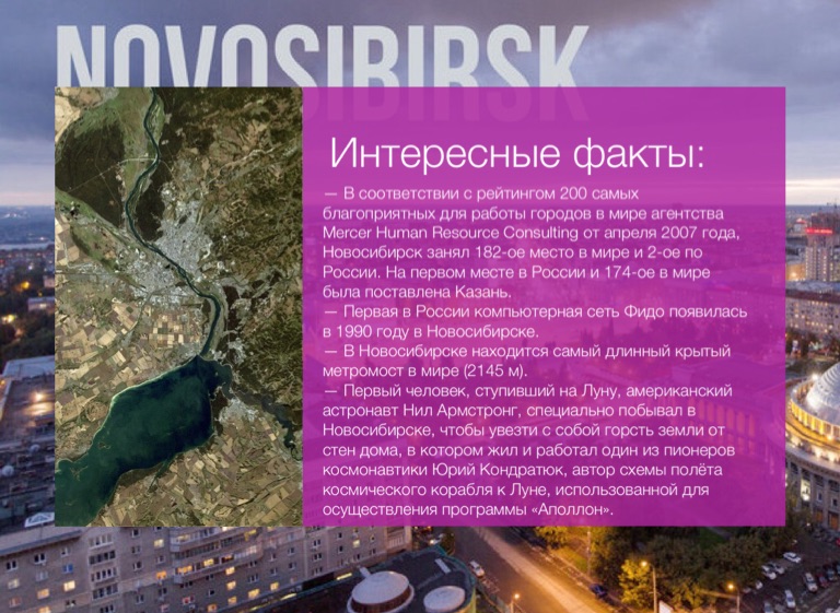— В соответствии с рейтингом 200 самых благоприятных для работы городов в мире агентства Mercer Human Resource Consulting от апреля 2007 года, Новосибирск занял 182-ое место в мире и 2-ое по России. На первом месте в России и 174-ое в мире была поставлена Казань.