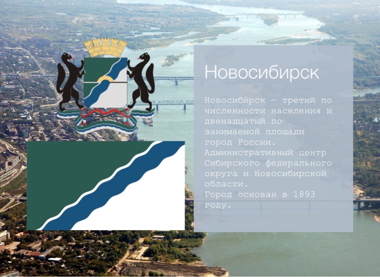 Новосиби́рск — третий по численности населения и двенадцатый по занимаемой площади город России. Административный центр Сибирского федерального округа и Новосибирской области.