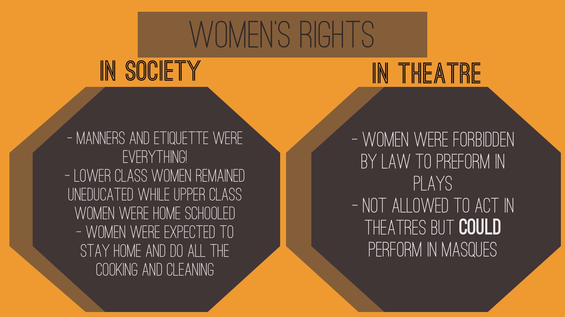 - Women were forbidden by law to preform in plays