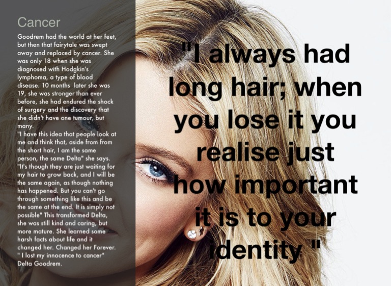 "I have this idea that people look at me and think that, aside from from the short hair, I am the same person, the same Delta" she says. "It's though they are just waiting for my hair to grow back, and I will be the same again, as though nothing has happened. But you can't go through something like this and be the same at the end. It is simply not possible" This transformed Delta, she was still kind and caring, but more mature. She learned some harsh facts about life and it changed her. Changed her Forever.
