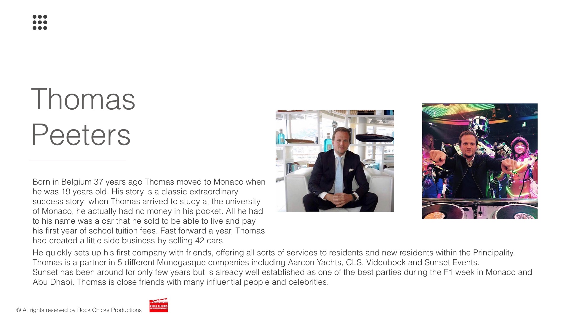 Sunset has been around for only few years but is already well established as one of the best parties during the F1 week in Monaco and Abu Dhabi. Thomas is close friends with many influential people and celebrities.