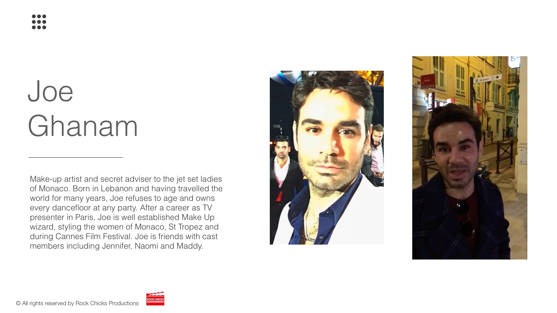 Make-up artist and secret adviser to the jet set ladies of Monaco. Born in Lebanon and having travelled the world for many years, Joe refuses to age and owns every dancefloor at any party. After a career as TV presenter in Paris, Joe is well established Make Up wizard, styling the women of Monaco, St Tropez and during Cannes Film Festival. Joe is friends with cast members including Jennifer, Naomi and Maddy.