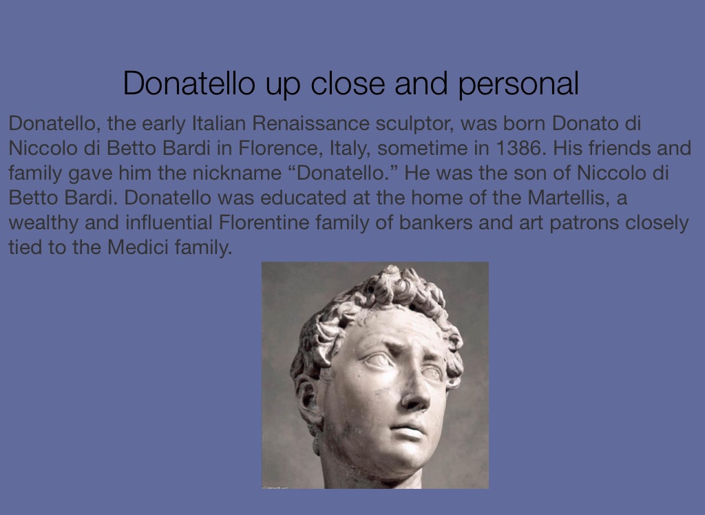 Donatello, the early Italian Renaissance sculptor, was born Donato di Niccolo di Betto Bardi in Florence, Italy, sometime in 1386. His friends and family gave him the nickname “Donatello.” He was the son of Niccolo di Betto Bardi. Donatello was educated at the home of the Martellis, a wealthy and influential Florentine family of bankers and art patrons closely tied to the Medici family.
