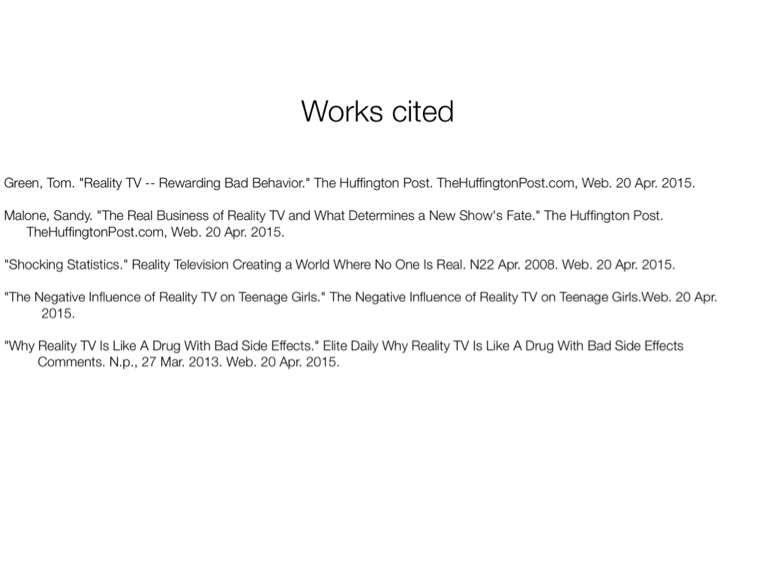 "Shocking Statistics." Reality Television Creating a World Where No One Is Real. N22 Apr. 2008. Web. 20 Apr. 2015.