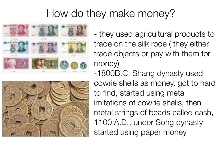-1800B.C. Shang dynasty used cowrie shells as money, got to hard to find, started using metal imitations of cowrie shells, then metal strings of beads called cash, 1100 A.D., under Song dynasty started using paper money
