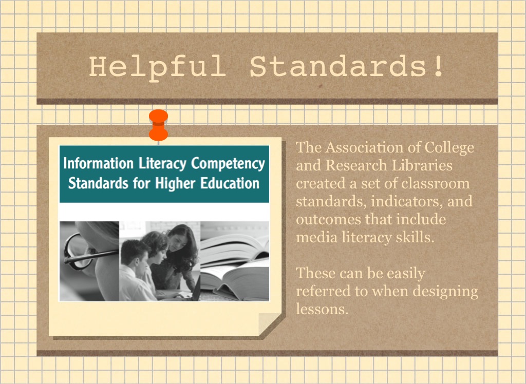The Association of College and Research Libraries created a set of classroom standards, indicators, and outcomes that include media literacy skills.