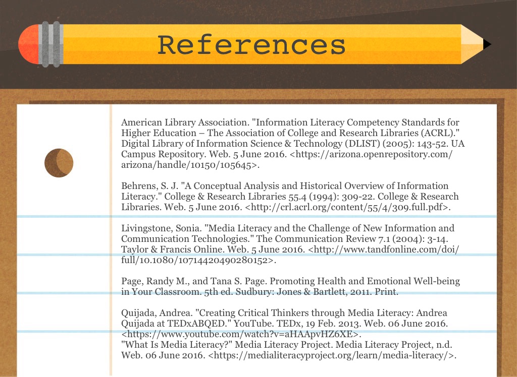 "What Is Media Literacy?" Media Literacy Project. Media Literacy Project, n.d. Web. 06 June 2016. <https://medialiteracyproject.org/learn/media-literacy/>.