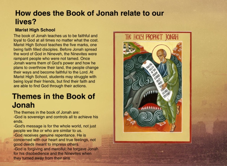The book of Jonah teaches us to be faithful and loyal to God at all times no matter what the cost. Marist High School teaches the five marks, one being faith filled disciples. Before Jonah spread the word of God in Nineveh, the Ninevites were rampant people who were not tamed. Once Jonah warns them of God's power and how he plans to overthrow their land, the people change their ways and become faithful to the Lord. At Marist High School, students may struggle with being loyal their friends, but find their faith and are able to find God through their actions.