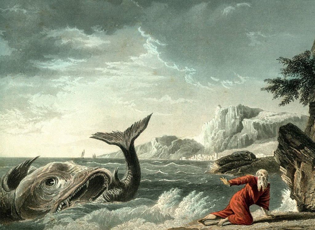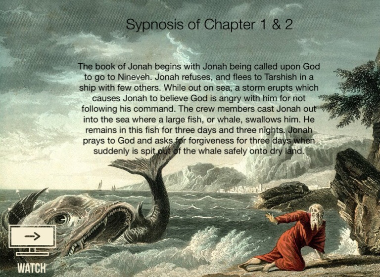 The book of Jonah begins with Jonah being called upon God to go to Nineveh. Jonah refuses, and flees to Tarshish in a ship with few others. While out on sea, a storm erupts which causes Jonah to believe God is angry with him for not following his command. The crew members cast Jonah out into the sea where a large fish, or whale, swallows him. He remains in this fish for three days and three nights. Jonah prays to God and asks for forgiveness for three days when suddenly is spit out of the whale safely onto dry land.