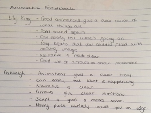 After creating an animatic for my short film I asked my target audience for some feedback to see if there was any improvements I could make when producing my final product. From the feedback I had received it was all very positive, which suggested that the ideas I had would successfully achieve my target audience in the end. Most of the feedback included comments such as a clear narrative and the animations come together to portray a well constructed storyline. However, the improvements within the feedback allowed me improve some of the shots included and less pauses during the voiceover.