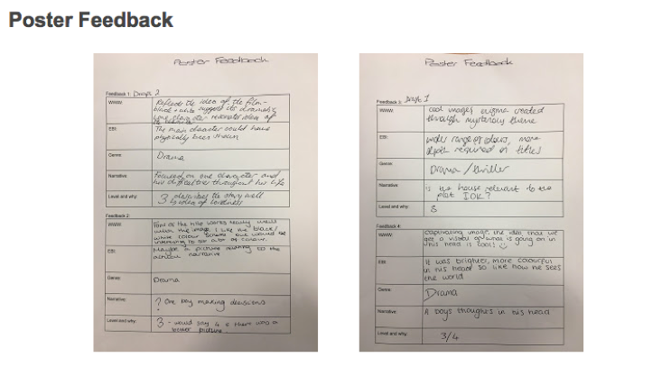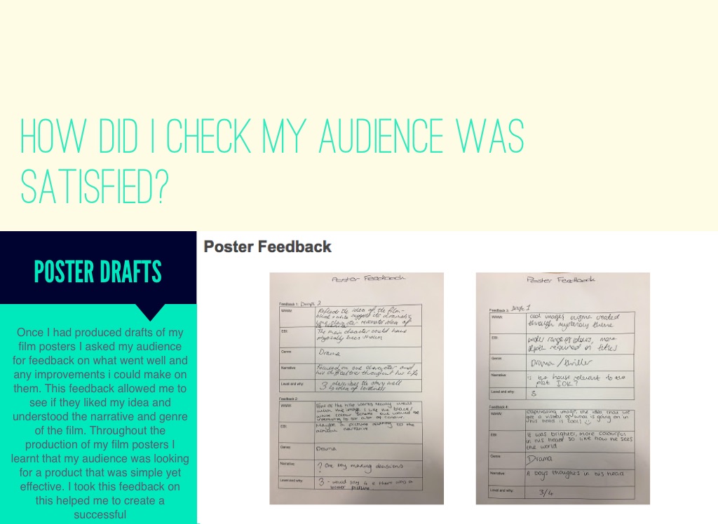 Once I had produced drafts of my film posters I asked my audience for feedback on what went well and any improvements i could make on them. This feedback allowed me to see if they liked my idea and understood the narrative and genre of the film. Throughout the production of my film posters I learnt that my audience was looking for a product that was simple yet effective. I took this feedback on this helped me to create a successful