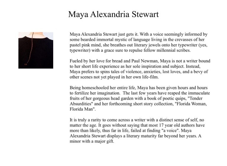 Being homeschooled her entire life, Maya has been given hours and hours to fertilize her imagination. The last few years have reaped the immaculate fruits of her gorgeous head garden with a book of poetic quips, "Tender Absurdities" and her forthcoming short story collection, "Florida Woman, Florida Man".