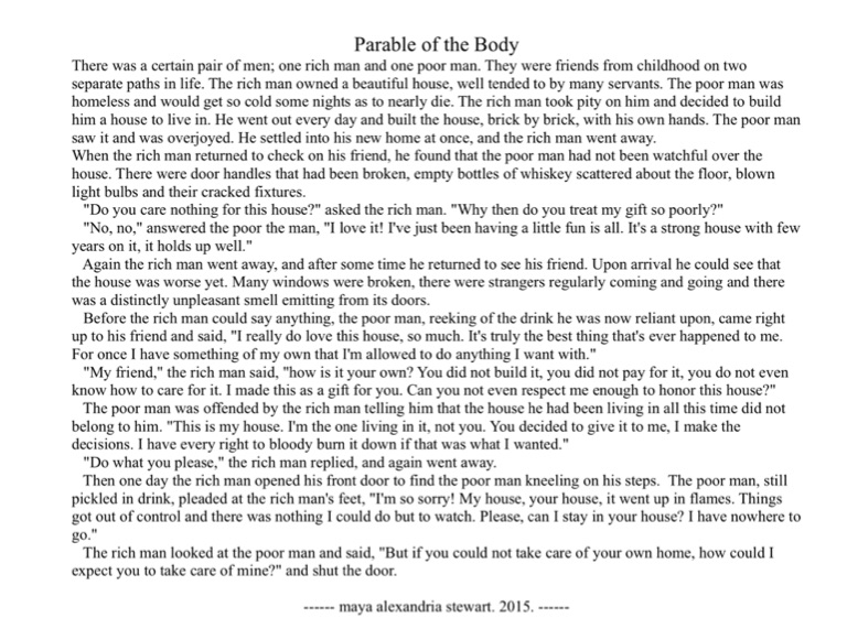 Before the rich man could say anything, the poor man, reeking of the drink he was now reliant upon, came right up to his friend and said, "I really do love this house, so much. It's truly the best thing that's ever happened to me. For once I have something of my own that I'm allowed to do anything I want with."