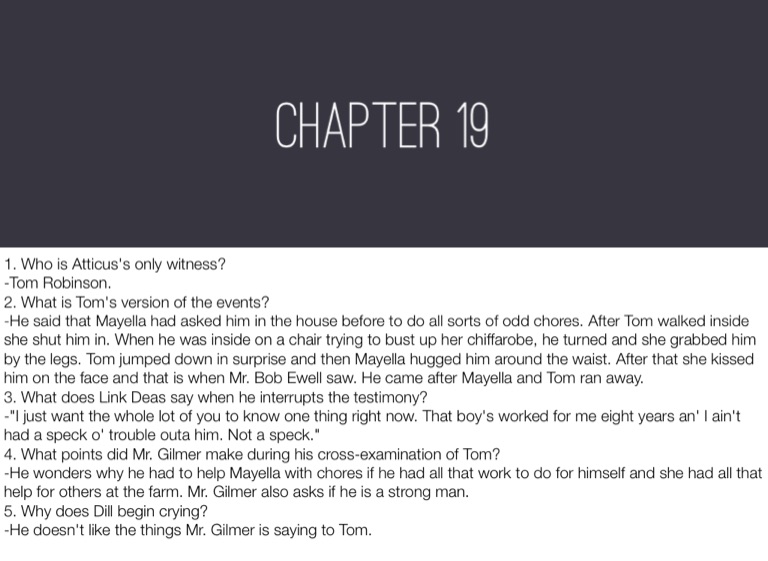 -He wonders why he had to help Mayella with chores if he had all that work to do for himself and she had all that help for others at the farm. Mr. Gilmer also asks if he is a strong man.