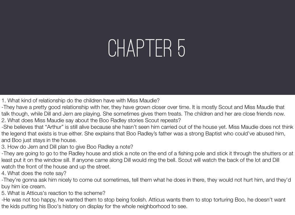 -She believes that “Arthur” is still alive because she hasn’t seen him carried out of the house yet. Miss Maudie does not think the legend that exists is true either. She explains that Boo Radley’s father was a strong Baptist who could’ve abused him, and Boo just stays in the house.