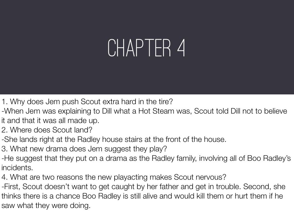 -He suggest that they put on a drama as the Radley family, involving all of Boo Radley’s incidents.