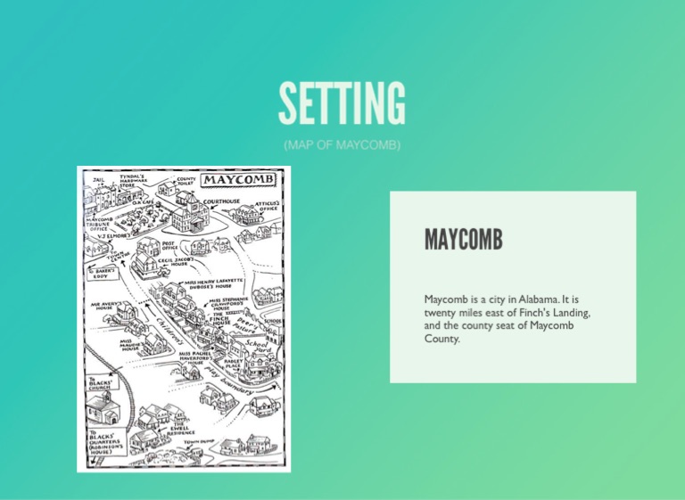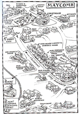 Maycomb is a city in Alabama. It is twenty miles east of Finch's Landing, and the county seat of Maycomb County.