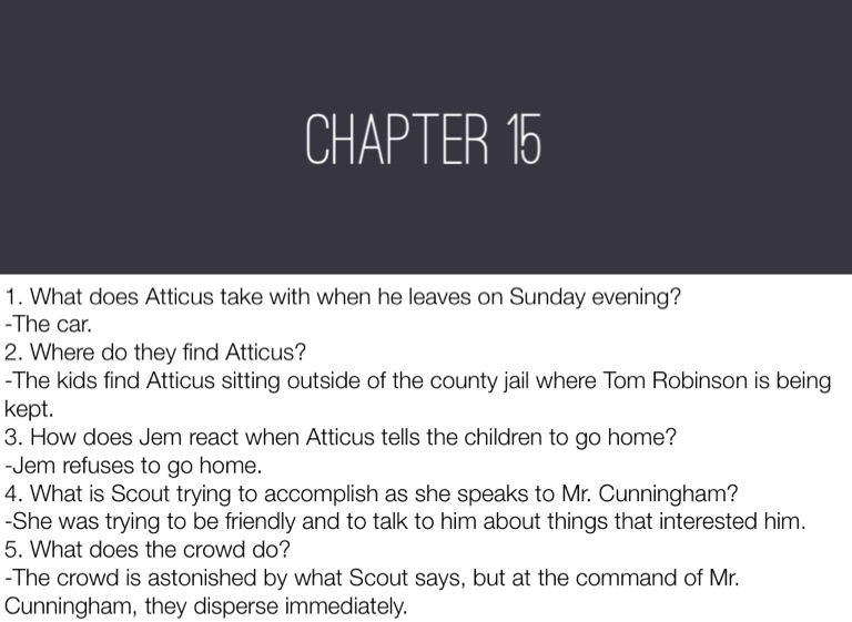 -The kids find Atticus sitting outside of the county jail where Tom Robinson is being kept.