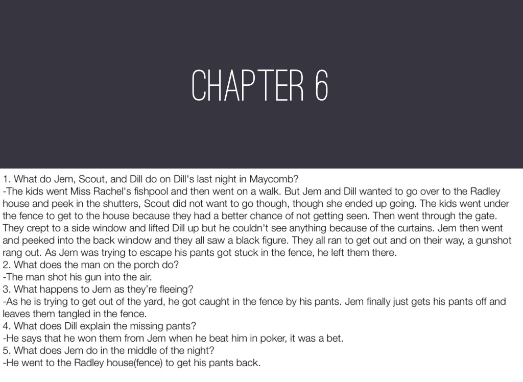 -The kids went Miss Rachel's fishpool and then went on a walk. But Jem and Dill wanted to go over to the Radley house and peek in the shutters, Scout did not want to go though, though she ended up going. The kids went under the fence to get to the house because they had a better chance of not getting seen. Then went through the gate. They crept to a side window and lifted Dill up but he couldn't see anything because of the curtains. Jem then went and peeked into the back window and they all saw a black figure. They all ran to get out and on their way, a gunshot rang out. As Jem was trying to escape his pants got stuck in the fence, he left them there.