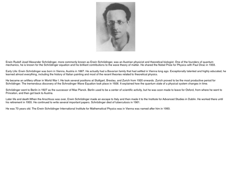 Early Life: Erwin Schrödinger was born in Vienna, Austria in 1887. He actually had a Bavarian family that had settled in Vienna long ago. Exceptionally talented and highly educated, he learned almost everything, including the history of Italian painting and most of the recent theories related to theoretical physics.